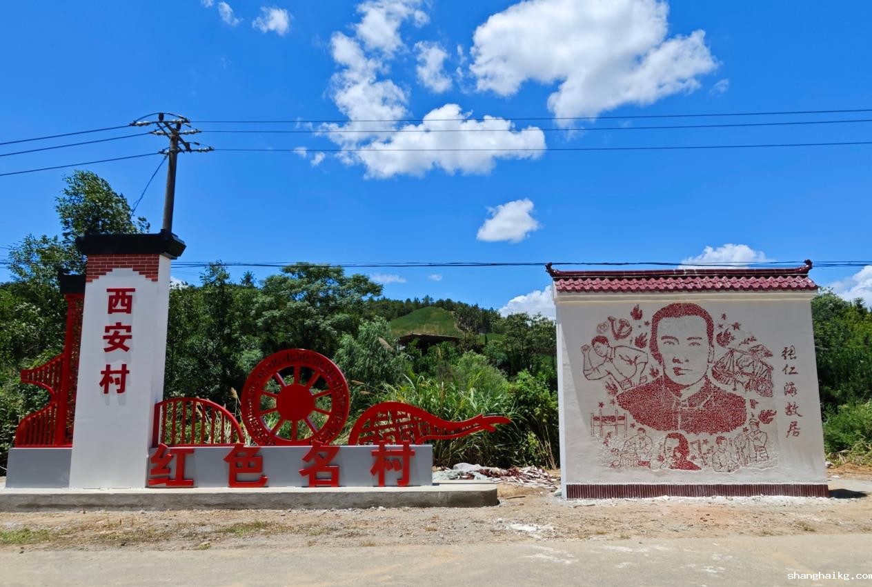 图为“红色名村”村牌和红色瓷墙全貌,李雨恒、王迎风、王一如供图