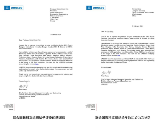 近日,联合国教科文组织给2023首届未来设计师·国际创新设计大赛(International Innovation Design Contest,简称IIDA)所有获奖选手颁发了获奖证书,同时也给所有终评专家发来了感谢信。至此,2023首届IIDA大赛圆满结束。