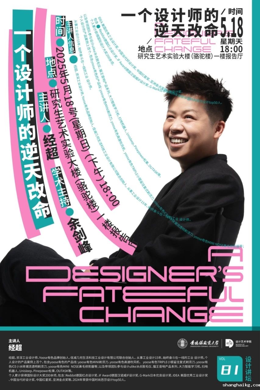 2025年5月18日下午,Yoose有色品牌创始人经超在研究生艺术实验大楼报告厅做了题为《一个设计师的逆天改命》的专题讲座,讲座由星空手机版安全院长余剑峰主持。