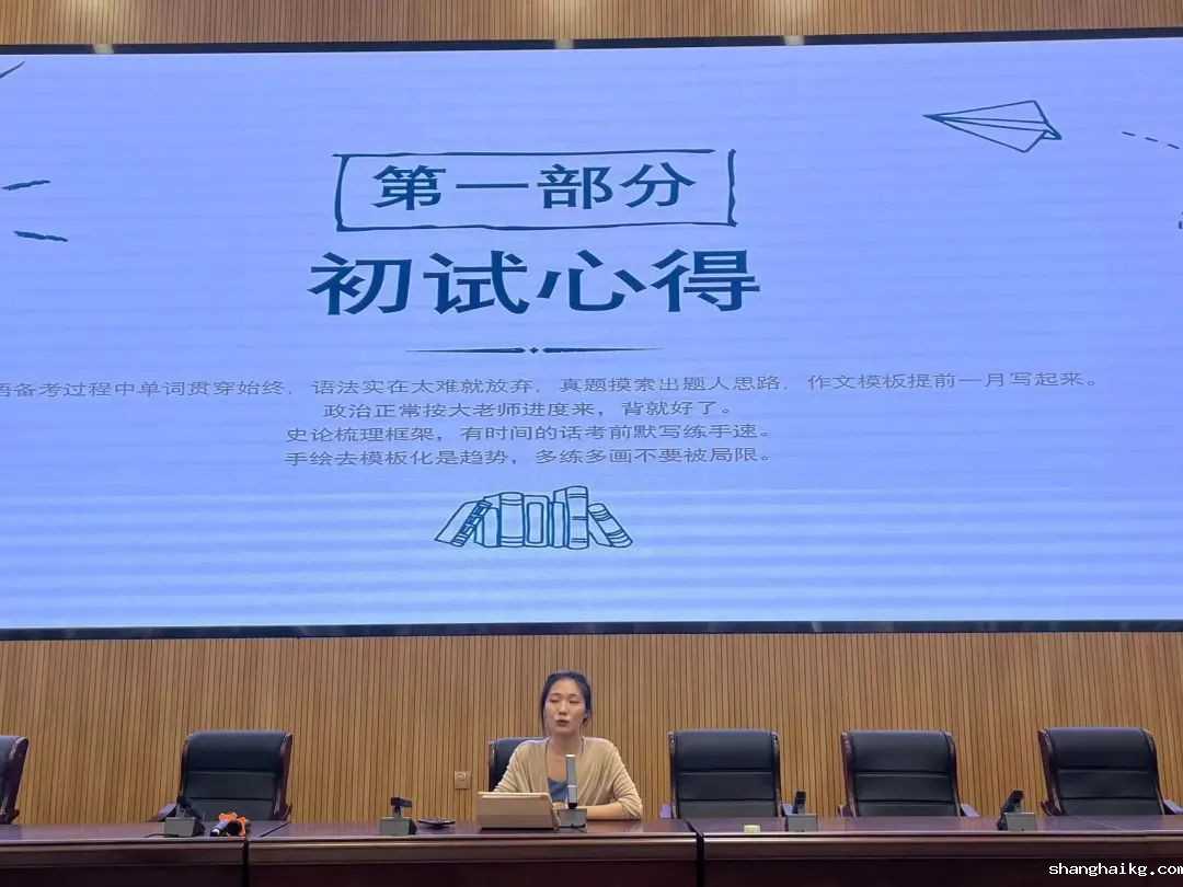 交流会上,沈莉丽同学首先介绍了我们考研经历的全流程,帮助我们明确初试复试的各个时间节点,并分享了备考初试和复试的学习经验。她总结道:背单词应是贯穿于考研英语始终的过程、在不同阶段灵活利用资料复习政治、多画思维导图去整理史论使自己逻辑清晰。