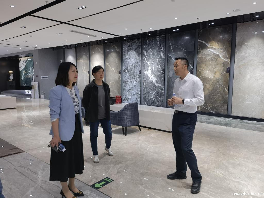 考察期间,研发中心副总经理李惠文接待并带领一行人员参观了企业产品展厅,随后在蒙娜丽莎研究院内参观了研发中心办公区域,探访慰问了近几年在企业就职的我院毕业生。接着与集团总工程师潘利敏等主要负责人进行了座谈交流,王媛媛老师展示介绍了我院部分优秀学生作品。