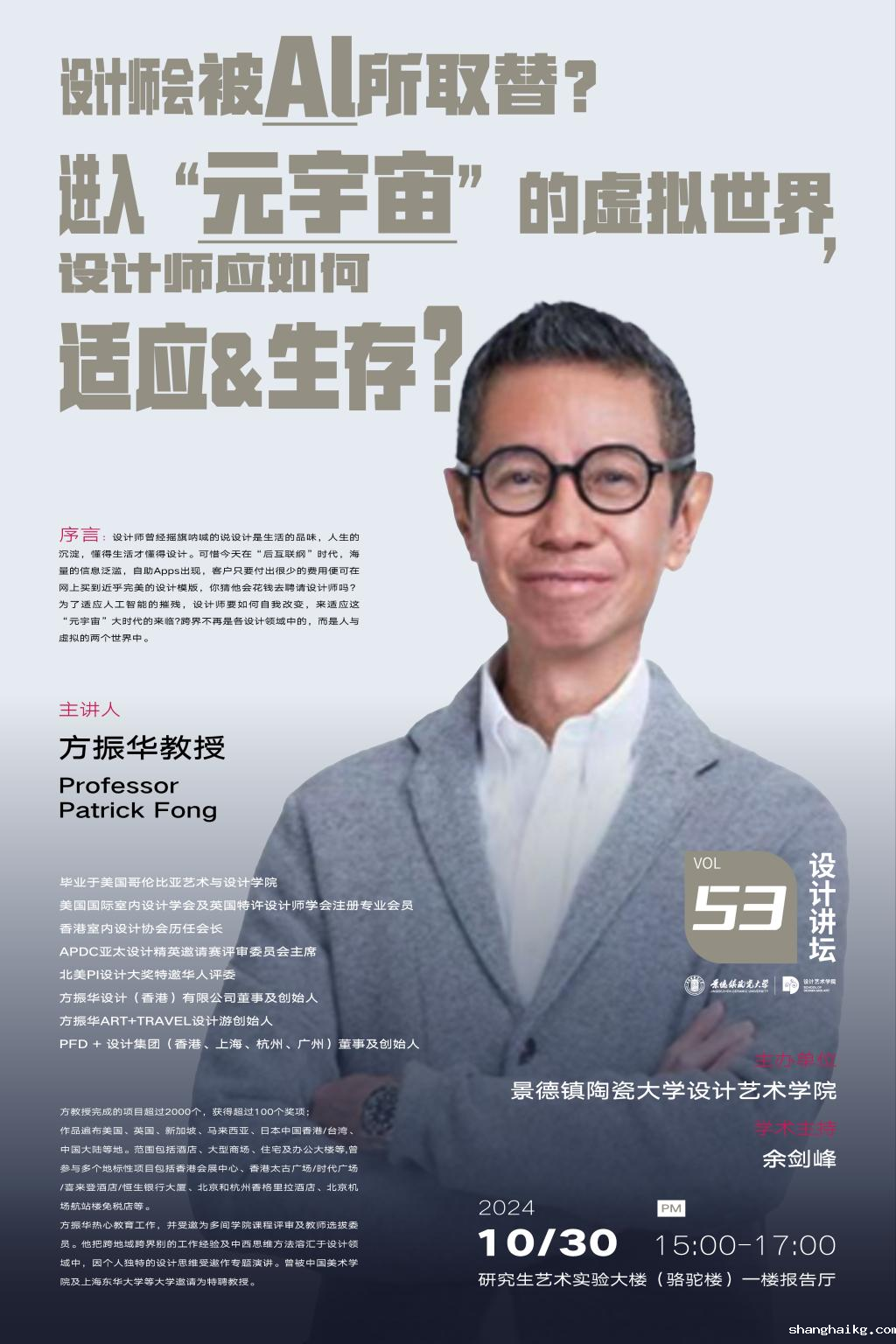2024年10月30日下午15:00点,方振华设计(香港)有限公司董事及创始人方振华在研究生艺术实验楼一楼报告厅作了题为《设计师会被AI所取替?进入“元宇宙”的虚拟世界,设计师应如何适应&生存?》的专题讲座,讲座由星空手机版安全副院长余剑锋(主持行政工作)主持。