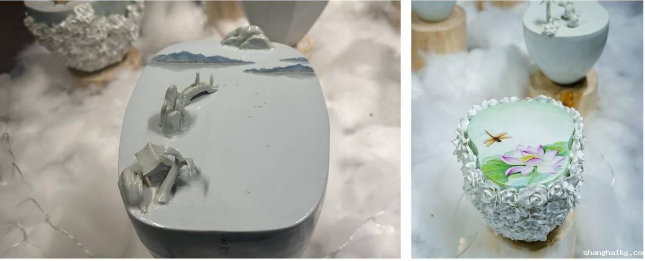 在展览的现场,观众能够欣赏到形态各异的陶瓷艺术作品。有些作品展现了作者娴熟的釉上绘画技巧;有些作品以传统团扇为蓝本,有些是主题作品的延伸,是对团扇艺术融合陶瓷艺术的更进一步阐释。无论哪件作品,都蕴含着丰富的情感和故事,使得每一件作品都充满了生命力和灵动性。